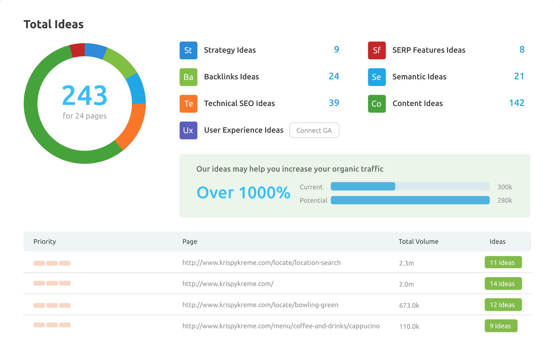 Si estás buscando formas de identificar fácilmente todos estos problemas, así como recibir una guía de cómo solucionarlos, puedes usar la herramienta Auditoría del sitio. Crea un nuevo proyecto, audítalo y deja que la herramienta rastree tu sitio. Buscará problemas y recopilará datos. Una vez que el rastreo ha sido completado, se te presentará un panel de recomendaciones.