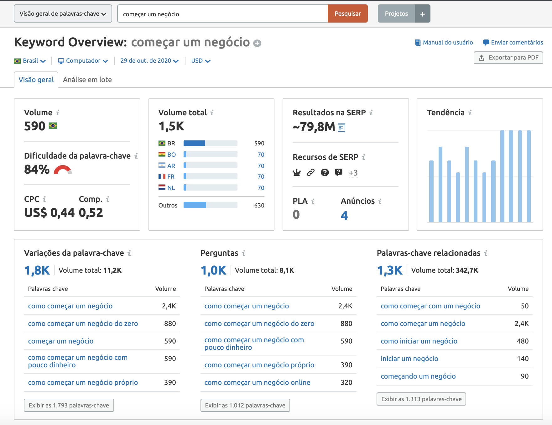 Comece com nossa ferramenta Visão geral de palavras-chave, para obter uma visão abrangente de uma palavra-chave alvo - incluindo o volume total de pesquisa, o quão competitivo é o espaço e as principais SERP Features.